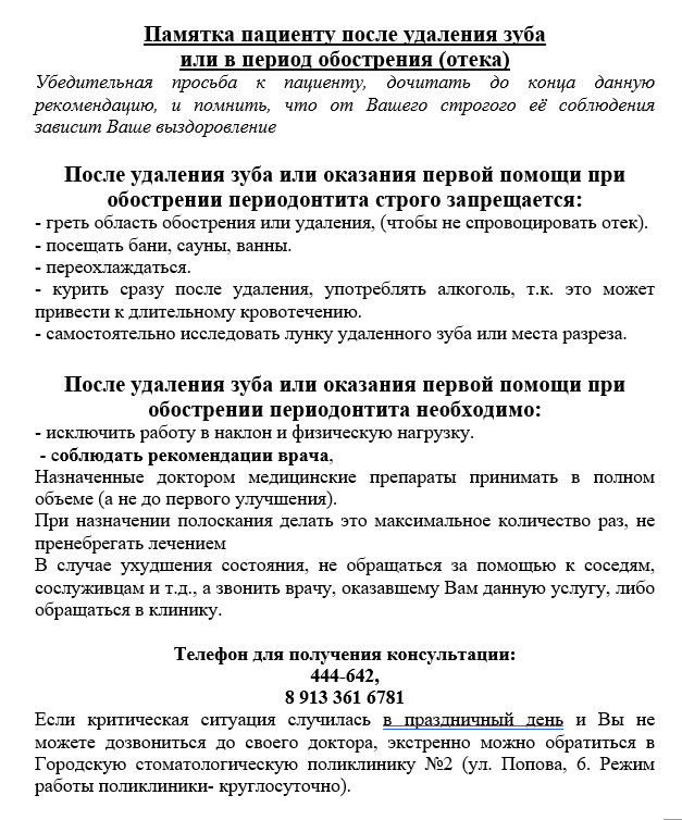 После удаления зуба нельзя категорически:* первые 1-2 дня нельзя принимать горячую ванну (теплый душ можно), а также спать, лежа на стороне удаленного зуба – все это будет способствовать появлению отека,